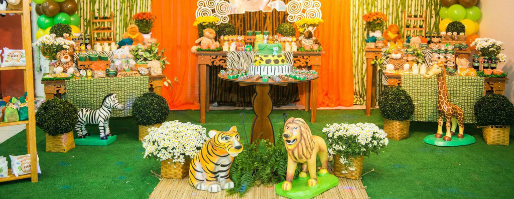 Use também as cores laranja e marrom, bem como peças de madeiras para deixar a festa com cara de safari. Não se esqueça dos bichinhos! Decore com animais, principalmente os da natureza selvagem, como leões e tigres, girafas, zebras, elefantes e macacos.